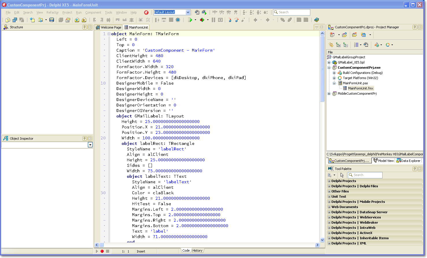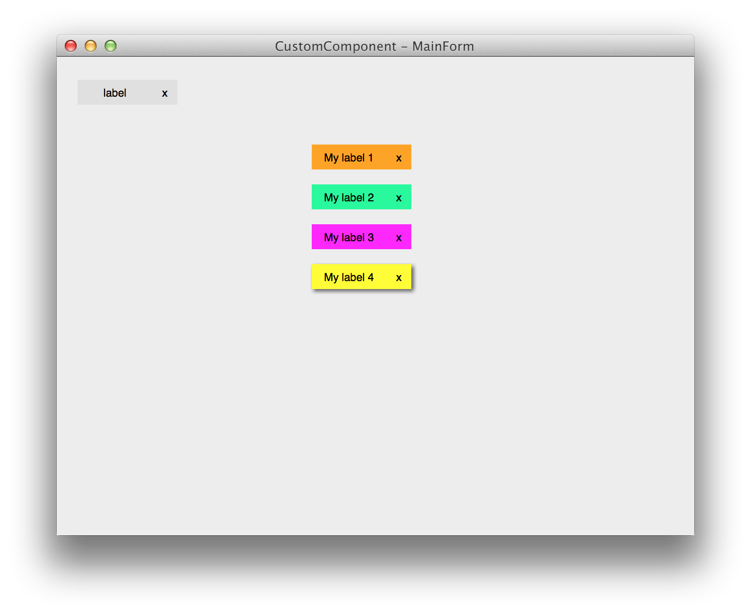 Come potete notare nella Structure View si vede anche un componente ShadowEffect1 applicato a GMailLabel4: ovviamente è possibile utilizzare il componente TGMailLabel esattamente come tutti i componenti standard FireMonkey e quindi ho aggiunto un effetto ombreggiatura che viene applicato a run-time (NB: nello screenshot seguente non è visibile per colpa del mio Win XP in esecuzione nella virtual machine sul mio MacBookPro, si vede bene nello screenshot Mac OS X).